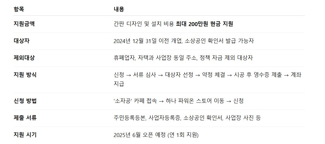 하나은행은 2025년 6월부터 전국 소상공인을 대상으로 하나 파워온 스토어 간판지원 프로젝트를 시작합니다. 이 프로젝트를 통해 간판지원금 200만원 신청방법을 숙지한 소상공인은 최대 200만 원의 디자인 및 시공 비용을 지원받을 수 있습니다. 특히 현금으로 지원되기 때문에 실제적으로 큰 도움이 됩니다.