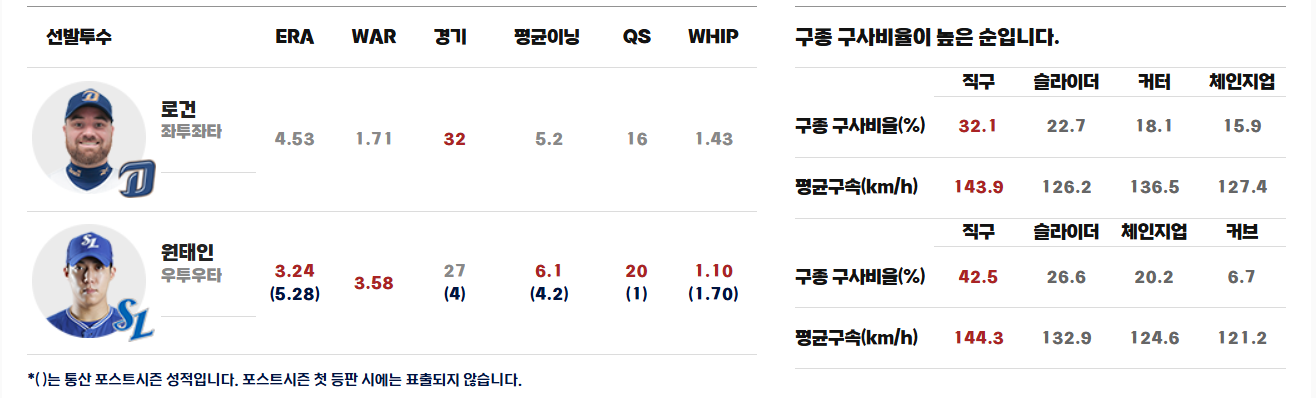 NC 다이노스의 로건(좌투), 삼성 라이온즈의 원태인(우투) 이다.