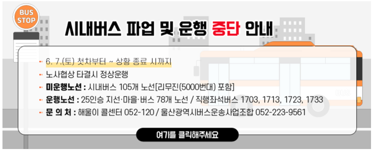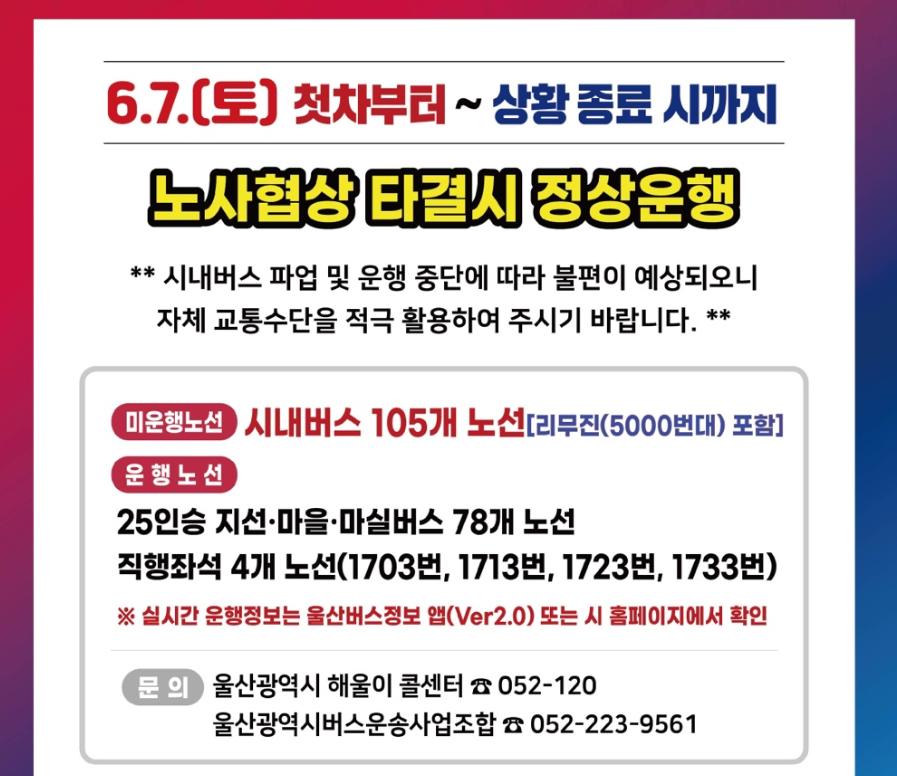 - 대체 교통수단: 울산시는 파업 기간 동안 대체 교통수단으로 전세버스 및 마을버스 투입을 검토 중입니다.