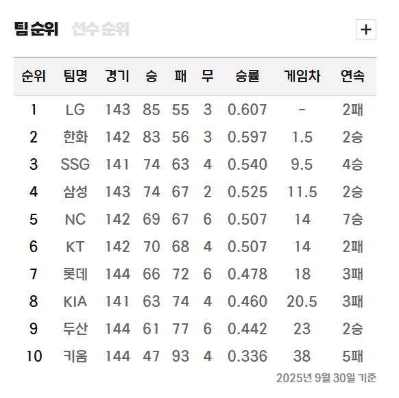 실시간 순위(9월 30일 기준)와 팀별 전력 분석
