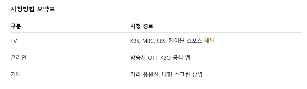 플레이오프 경기는 전국적으로 높은 시청률을 기록하기 때문에 다양한 채널에서 중계됩니다. TV에서는 지상파 3사(KBS, MBC, SBS)와 케이블 스포츠 채널이 중계를 담당합니다. 인터넷과 모바일은 방송사 OTT 서비스 티빙과 KBO 공식 앱을 통해 시청할 수 있으며, 일부 포털 사이트와 스포츠 전문 플랫폼도 실시간 스트리밍을 제공합니다. 최근에는 경기 현장 근처의 거리 응원전이나 대형 스크린 중계도 마련돼 현장 분위기를 간접 체험할 수 있습니다.