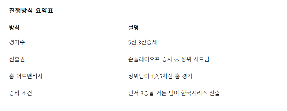 플레이오프는 5전 3선승제로 진행되며, 1위 팀을 제외한 상위권 구단들이 진출합니다. 준플레이오프 승자가 플레이오프에 올라오고, 여기서 승리한 팀이 최종적으로 한국시리즈에 진출합니다. 홈 어드밴티지는 정규 시즌 순위가 높은 팀에 주어지며, 보통 1, 2, 5차전을 홈에서 개최합니다. 무승부가 발생하면 연장전 없이 경기 종료 후 다음 경기로 넘어가며, 필요시 5차전까지 치러집니다.